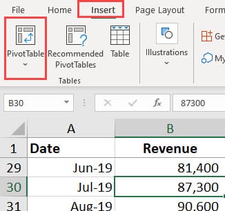 1. Select the cells you want to create a PivotTable from. 2. Select **Insert** > **PivotTable**.