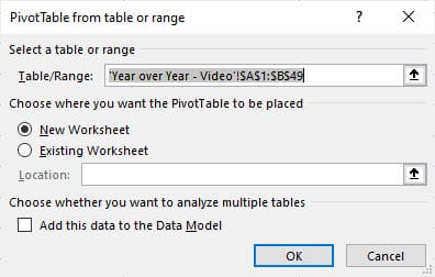 3. Under **Choose the data that you want to analyze**, select **Select a table or range**. 4. In **Table/Range**, verify the cell range. 5. Under **Choose where you want the PivotTable report to be placed**, select **New worksheet** to place the PivotTable in a new worksheet or **Existing worksheet** and then select the location you want the PivotTable to appear.