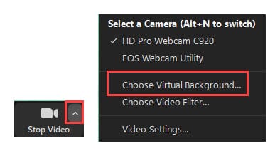 1. Be in a Zoom meeting 2. Click the **up arrow** next to stop video and select **Choose Virtual Background..**.