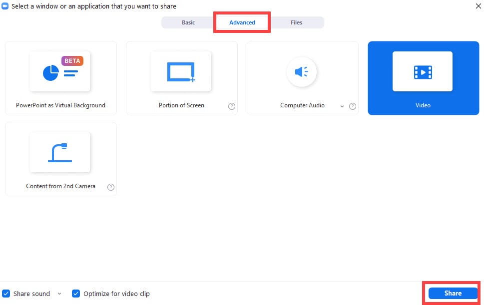 Notice that both Share sound and Optimize for video clip are automatically selected