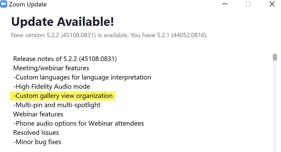 Zoom's version 5.2.2. allows you to rearrange the videos of participants in the gallery view in any order you want, during a Zoom meeting. Zoom calls this feature **Custom gallery view organization**. You can move the videos to show you or other participants anywhere you like... except if the host has turned on " **Follow Host's Video Order**". In that case, participants cannot rearrange the video order. With **Follow Host's Video Order** enabled, if the host puts videos in a certain order, the participants will also see their videos in this order. If a participant tries to move, they will get a warning message that they can't rearrange. This new feature works with Windows and macOS.