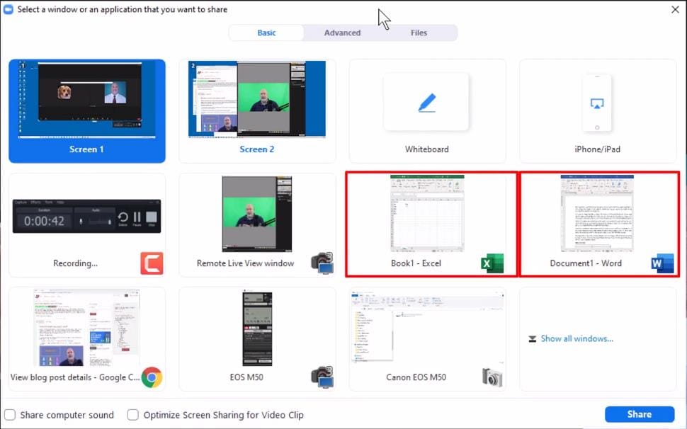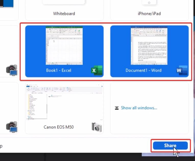 1\. During the meeting, click on **Share** in the bottom toolbar. You will see all your opened windows, waiting for you to select a window or application that you want to share. In this example, I want to share both Excel and Word.